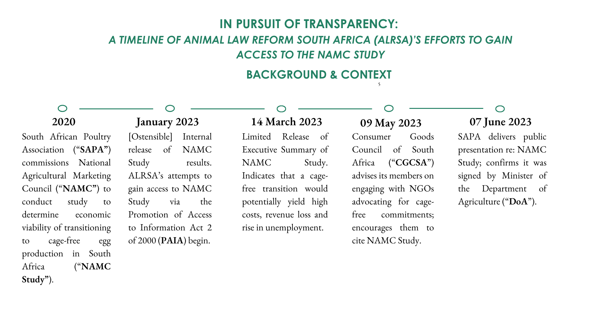 In 2020, the South African Poultry Association (“SAPA”) commissioned the National Agricultural Marketing Council (“NAMC”) to undertake an economic study on layer hen housing and production systems in South Africa, including the feasibility of transitioning the egg industry from caged to cage-free systems (“NAMC Study”). Despite the significant animal welfare concerns associated with battery cages, the NAMC Study allegedly concluded that a transition to cage-free production is not economically feasible in the South African context. Although the study was reportedly finalised and signed off by the Minister of Agriculture in January 2023, it has still not been made publicly available as of September 2025. Without access to the study, consumers cannot critically engage with the findings to determine whether they were justifiable.