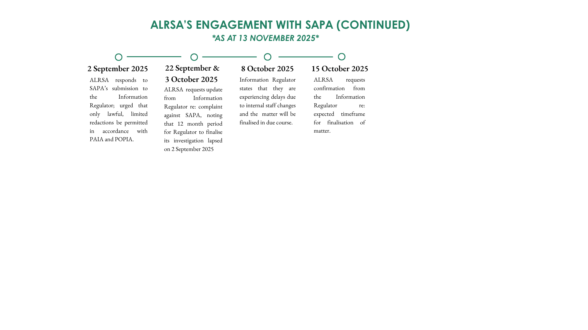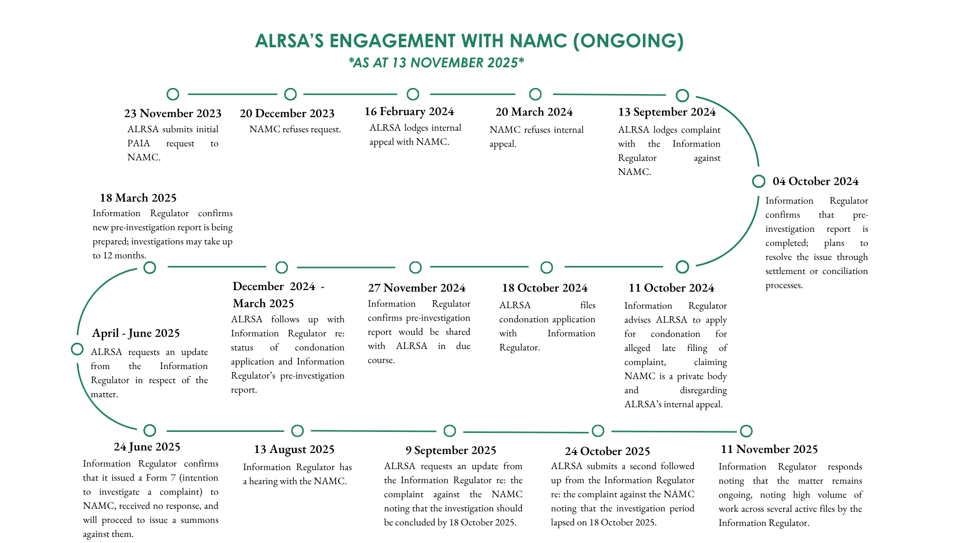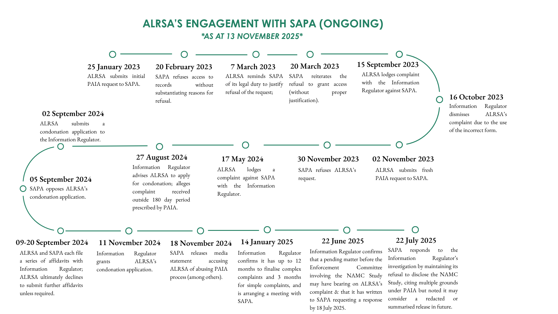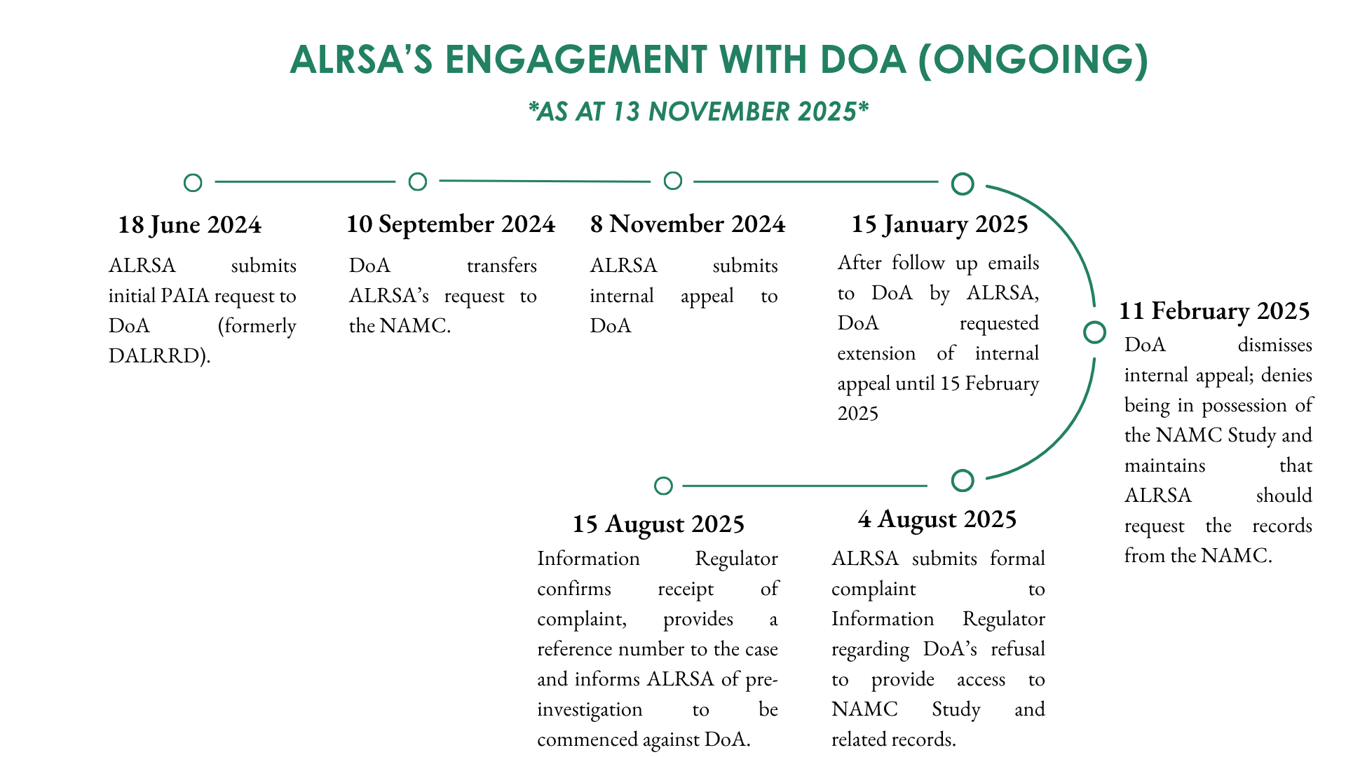 From January 2023 to present, ALRSA has undertaken multiple attempts to obtain the NAMC Study through formal requests under the Promotion of Access to Information Act (“PAIA”). However, the study remains inaccessible due to refusals, non-responses, or inadequate replies from these entities and/or the Information Regulator.